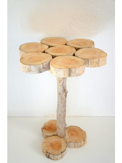 Treibholz-Ast ist als Tischbein eingefügt. Die Holzscheiben